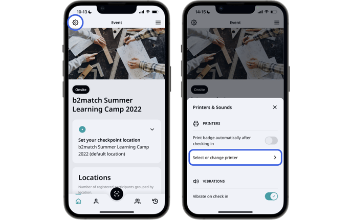 To pair the b2match Entrance app with the printer, tap on the settings icon in the upper left corner of the screen and tap Select or change printer.